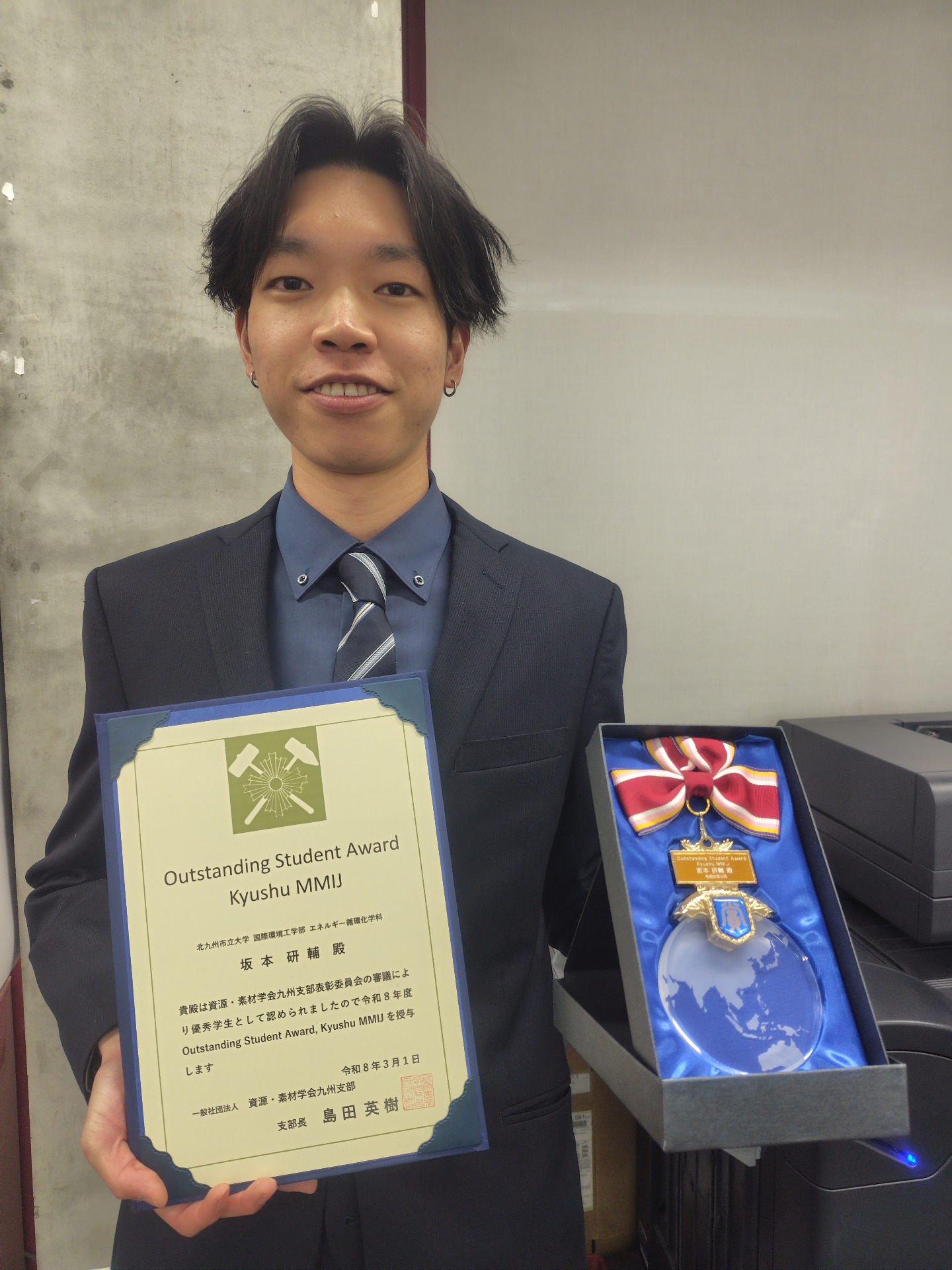 エネルギー循環化学科4年の坂本研輔が令和8年度Outstanding Student Award, Kyushu MMIJを資源・素材学会九州支部より授与されました。