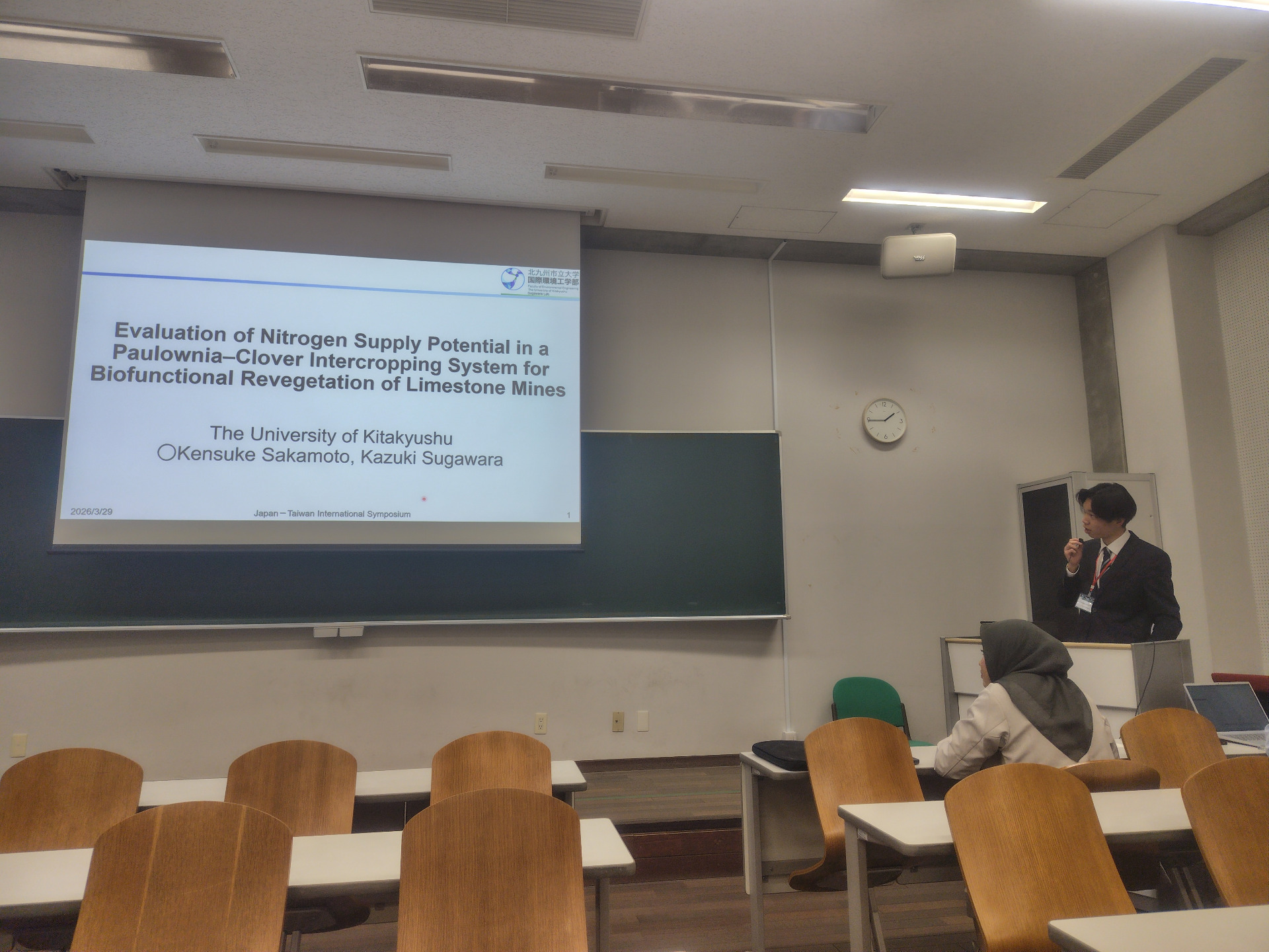 3月29日、30日に北九州市立大学にて開催された2026 Taiwan-Japan International Symposium on Environment Science, Technology and Managementにて修士1年の竹之内、中村、学部4年の坂本が口頭発表を行いました。